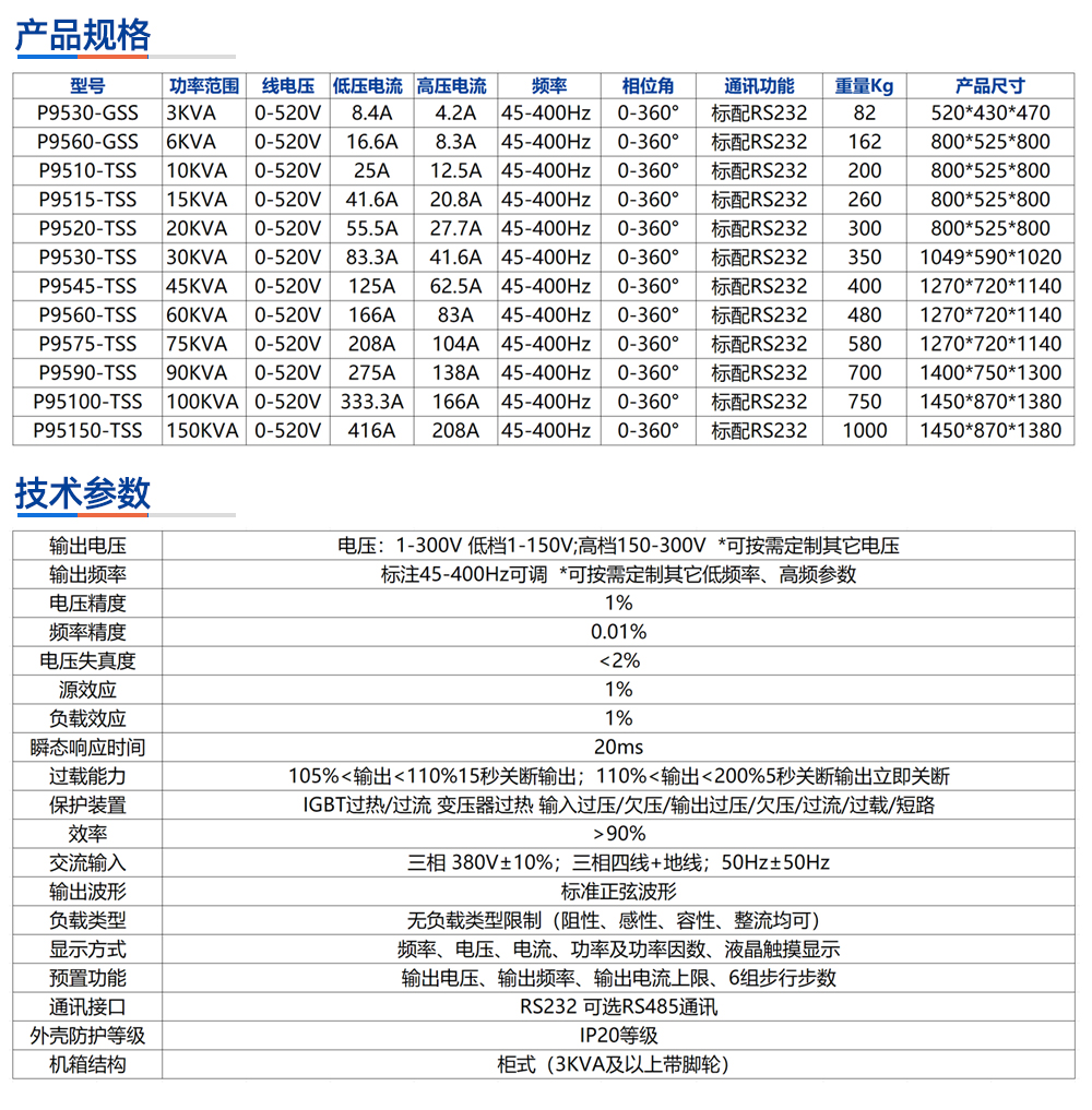 1-300V/45-400Hz 交流变频电源 P9510\15\20\30\45\60-\TSS系列