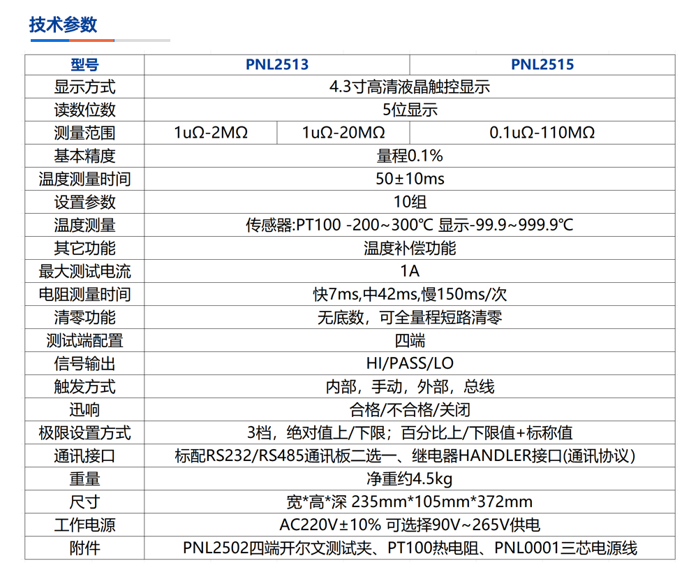 PNL2513/PNL2515系列直流电阻测试仪具有高精度宽量程高性价比的特点,采用当前主流的32bits CPU和高密度SMD贴装工艺、24位色4.3英寸IPS彩色液晶触摸屏,界面直观清爽、操作便捷。仪器具有较高的抗干扰性;量程范围为: 1uΩ-2MΩ;1uΩ-20MΩ;0.1uΩ-110MΩ;显示位数为四位半;测试速度最高可达20次/秒;测试精度最高为0.05%;温度补偿能免除环境温度对测试工作的影响;本仪器配备有专业分选功能与数据输出功能等,具有多样分选讯响设置,还可匹配Handler接口,应用于自动分选系统完成全自动流水线测试,使测试效率倍增。并配备RS232接口,用于远程控制和数据采集与分析。